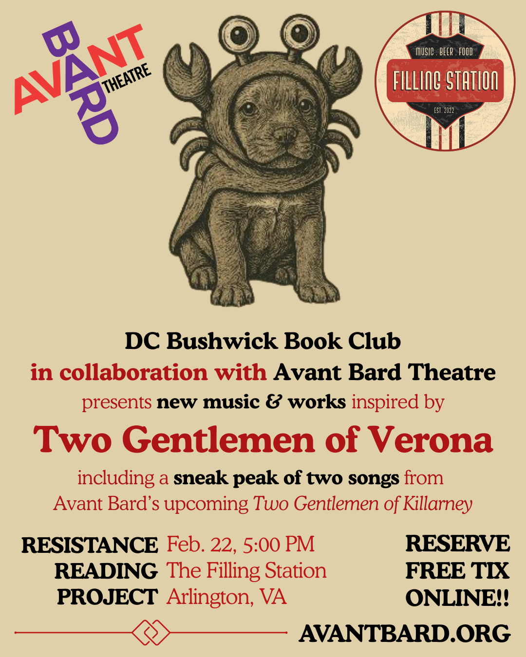 Avant Bard Theatre, in partnership with the DC Bushwick Book Club, presents new works of resistance inspired by Shakespeare’s Two Gentlemen of Verona, including a sneak peek of songs from Avant Bard’s March production of The Two Gentlemen of Killarney.
